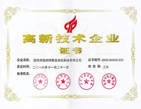 2016年11月21日,深圳市鉑納特斯自動化科技有限公司順利通過了國家高新技術(shù)企業(yè)認證,并于2017年1月16日收到了深圳市科技創(chuàng)新委員會、深圳市財政委員會、深圳市國家稅務(wù)局、深圳市地方稅務(wù)局聯(lián)合頒發(fā)的《高新技術(shù)企業(yè)證書》。